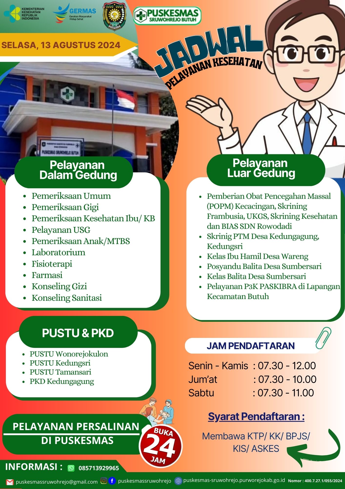 Kesehatan itu sangat penting sebagai pondasi dalam segala hal, mari kita jaga dengan berkala cek kesehatan, caranya bagaimana...?. Yuk manfaatkan pelayanan kesehatan yang ada di Puskesmas Sruwohrejo Butuh baik yang ada di dalam gedung maupun kegiatan diu luar gedung Puskesmas . . .